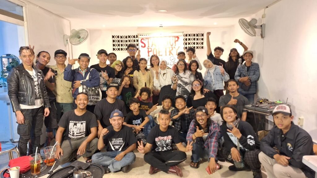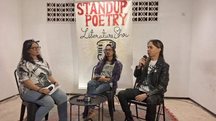 Orang-orang datang dengan latar yang beragam. Anak-anak skena duduk bersebelahan dengan pegiat sastra. Seorang pekerja kantoran masih mengenakan kemeja rapi, sementara di sudut lain orang tua muda menyimak sambil memantau balitanya yang sesekali bertanya dengan suara pelan. Tidak ada pagar sosial yang terlihat. Semua duduk sejajar, menyimak, mencatat, atau sekadar menatap kosong sambil mencerna.
